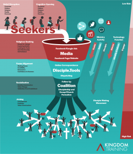Imagine Media to Disciple Making Movements (M2DMM) like a funnel that dumps masses of people into the top. The funnel filters out disinterested people. Finally, seekers who become disciples who plant churches and grow into leaders come out of the bottom of the funnel…